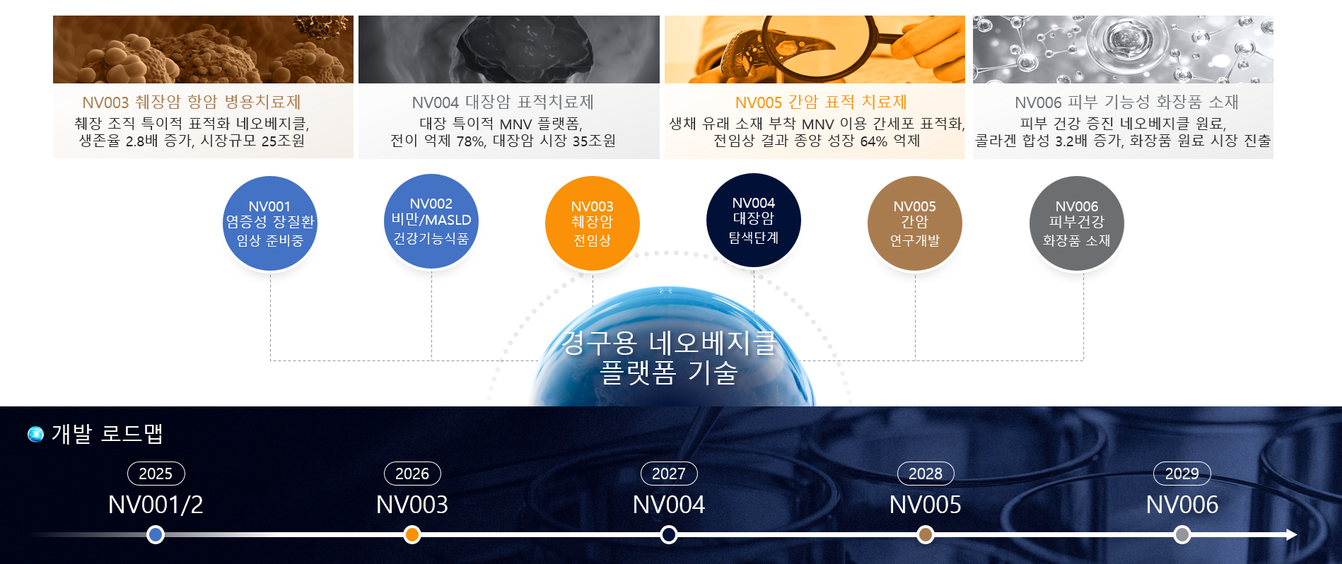 • 미충족 수요가 높은 난치성 소화기 및 대사질환 치료제 분야에서 미생물 유래 세포외소포체를 경구제로 전환하는 네오베지클(Neo vesicle) 플랫폼 기술 기반의 경구용 바이오의약품 개발을 통해 기업의 핵심 포트폴리오를 구축합니다.